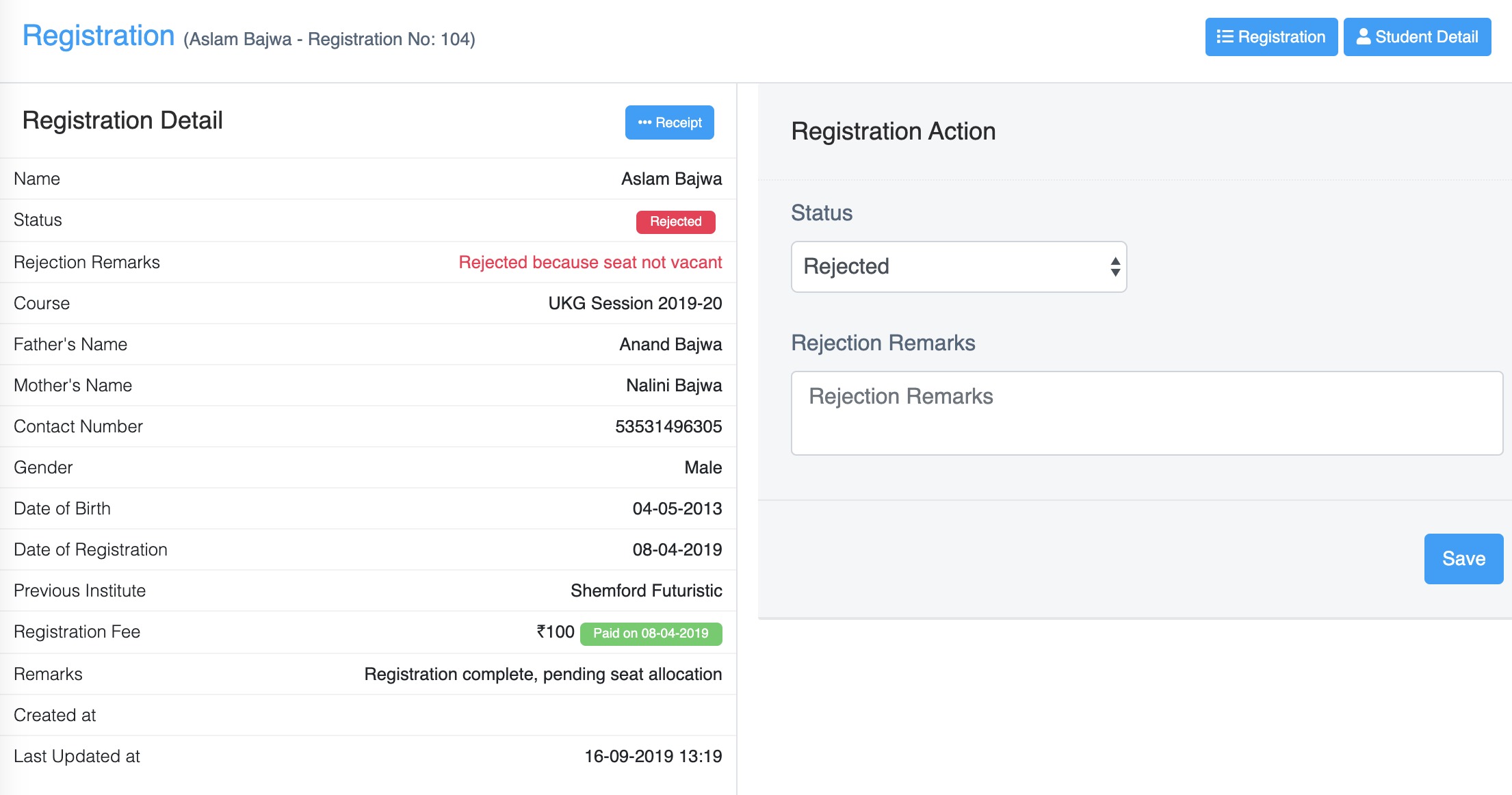 To clear the pending registration Administrator must go to the 'Action' column and click on the 'View details' button, which will lead you the Registration detail page (as shown in the screenshot below). Here administrator after filling up the desired details can finalize the new registration process.
